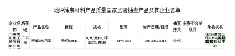 根據(jù)近日公布的結果,秀珀化工作為地坪漆行業(yè)的領導者,憑借雄厚的實力,扎實的質量、專業(yè)的管理,以傳統(tǒng)的環(huán)氧地坪漆順利通過了此次國家監(jiān)督抽查。其中地坪行業(yè)仍有7家企業(yè)的批次產品不符合標準的規(guī)定。